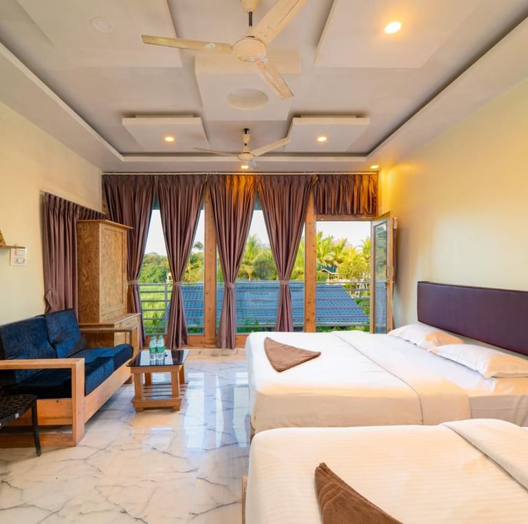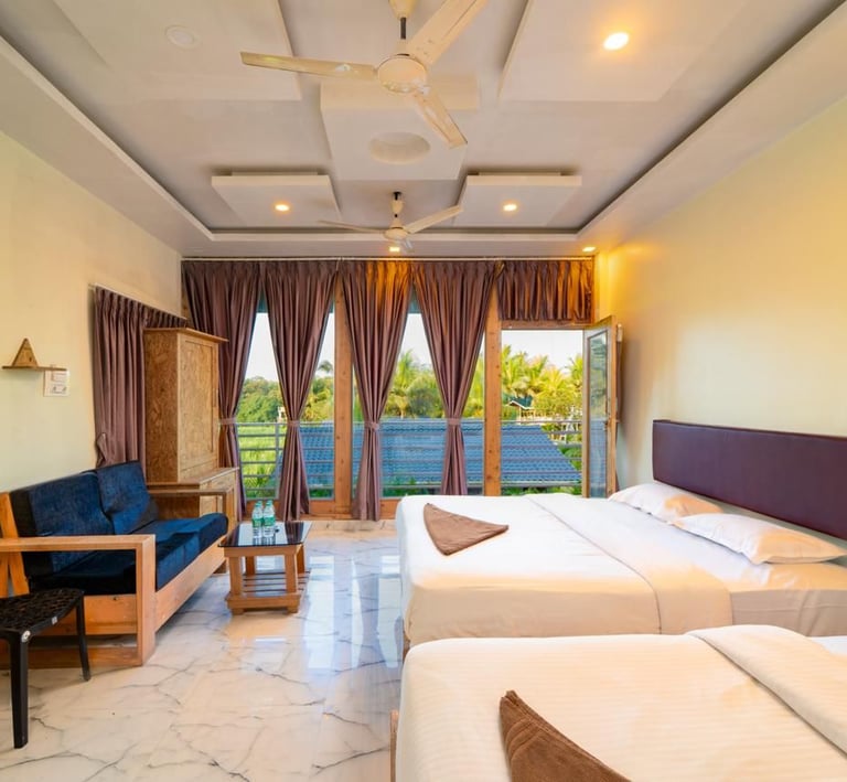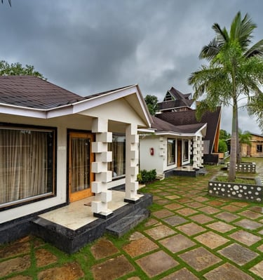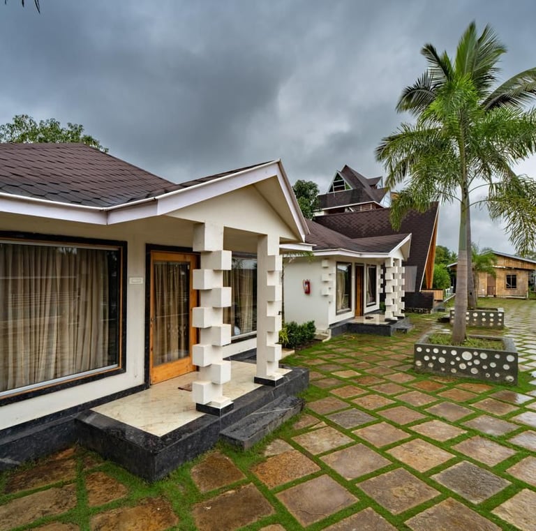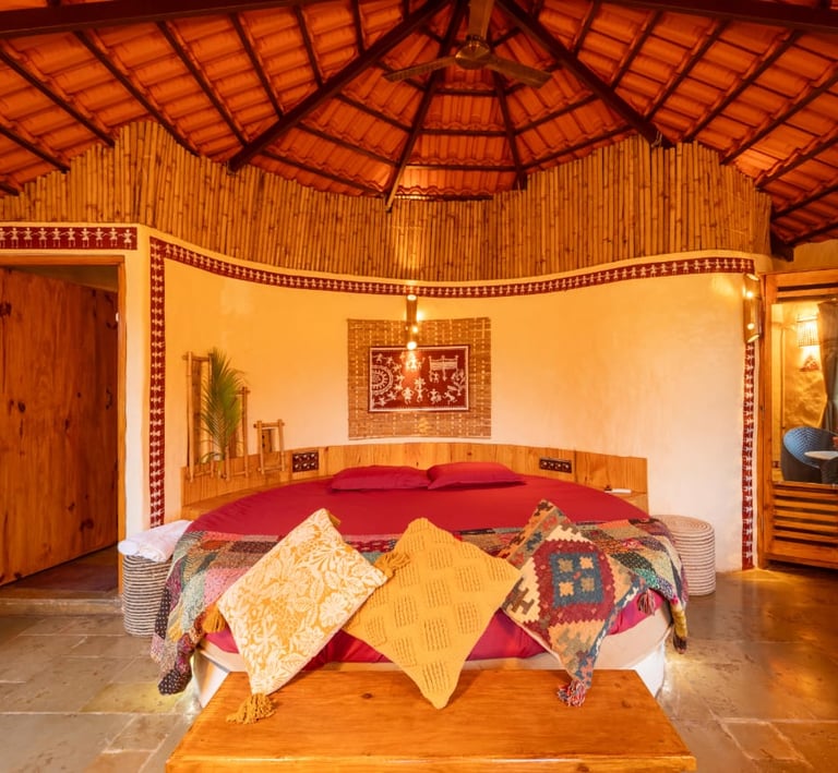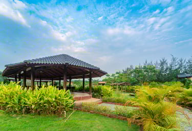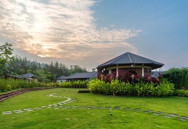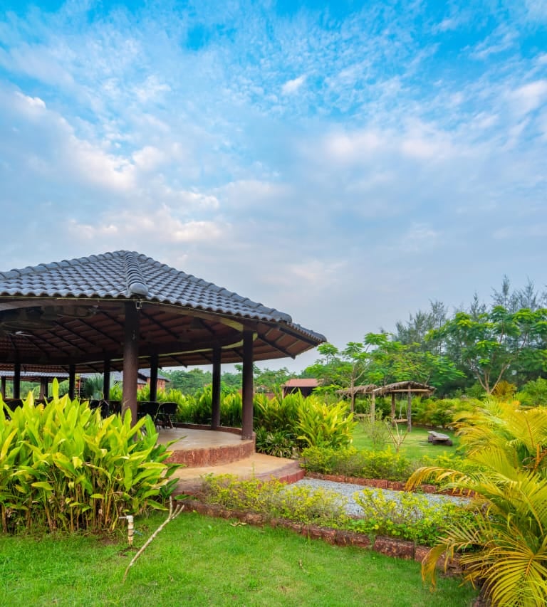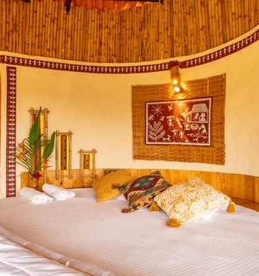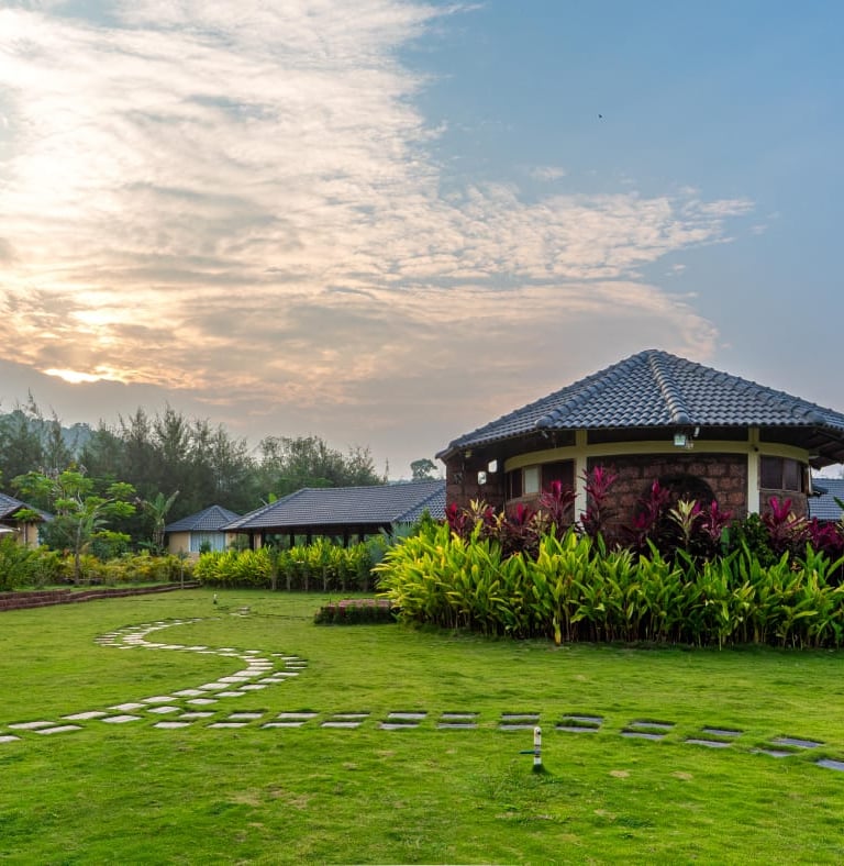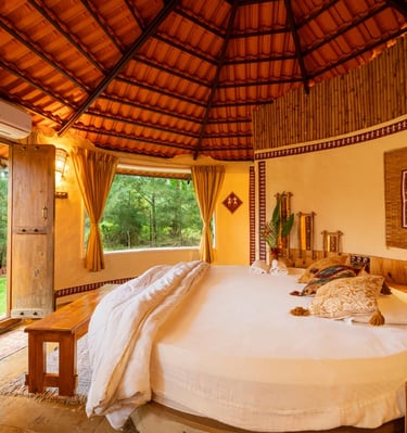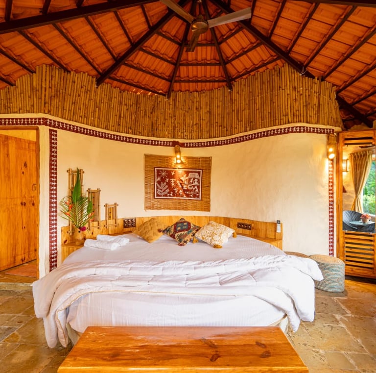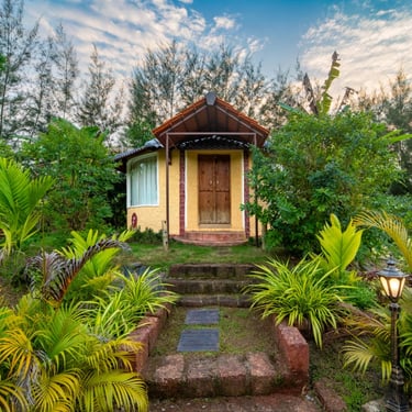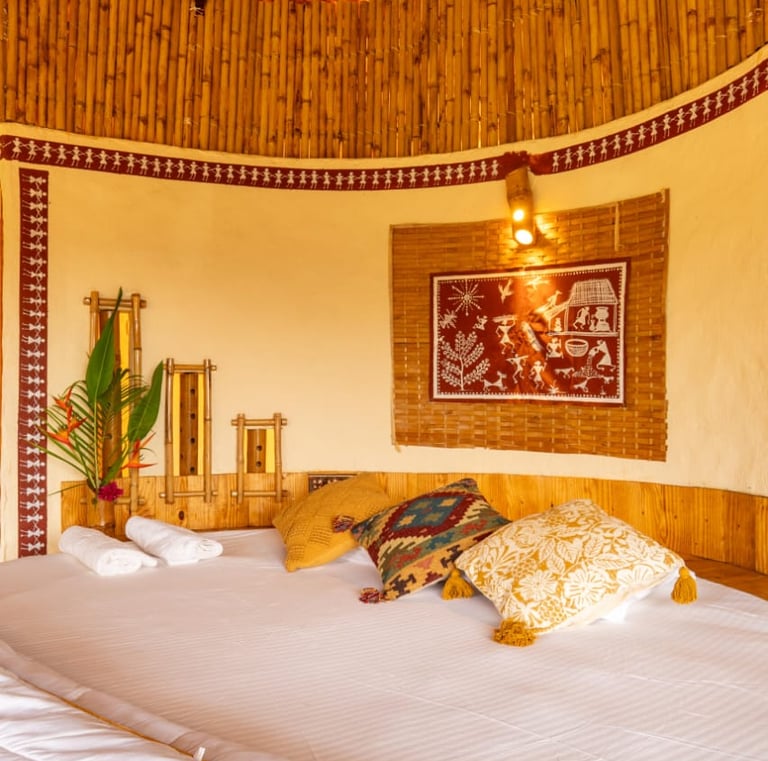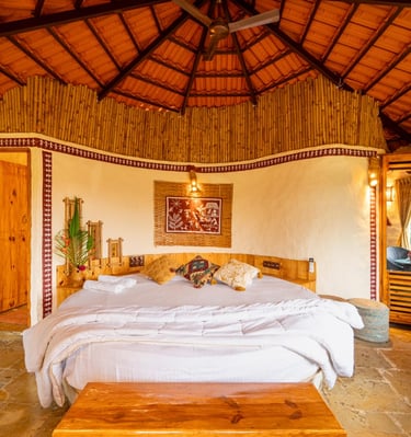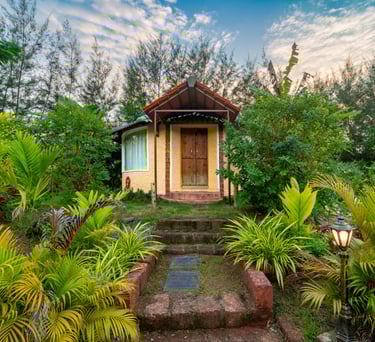 Cozy jungle cottages and tents nestled among lush orchids.